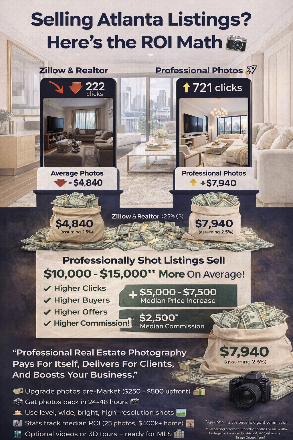 Most Atlanta listings don’t stall because of price — they stall because buyers never click. This breakdown shows how professional real estate photography directly increases clicks, showings, and final sale price — and why “good enough” photos quietly cost agents real money on every listing.